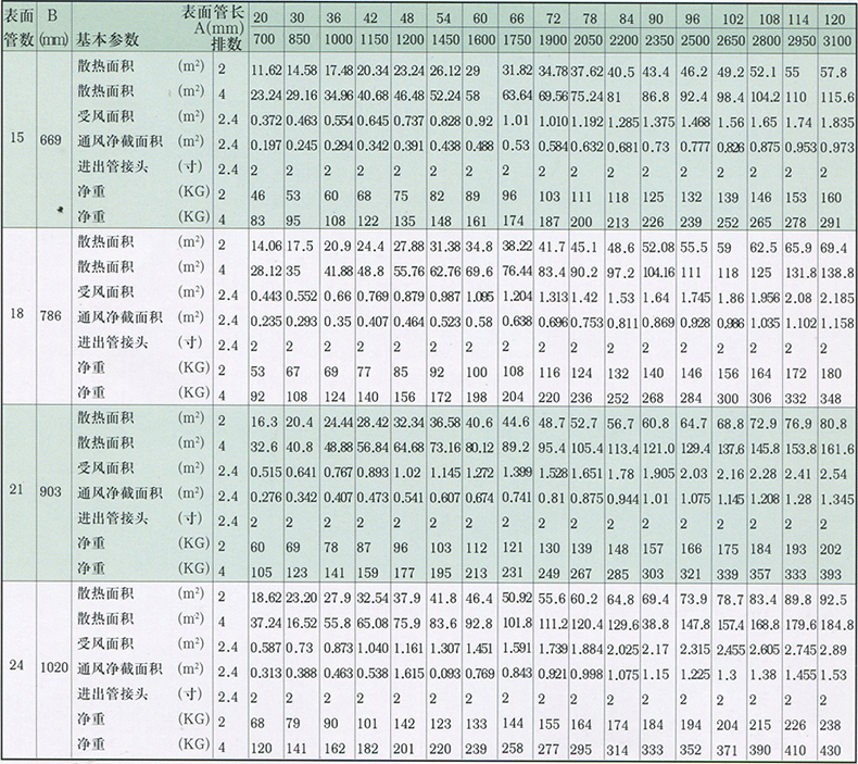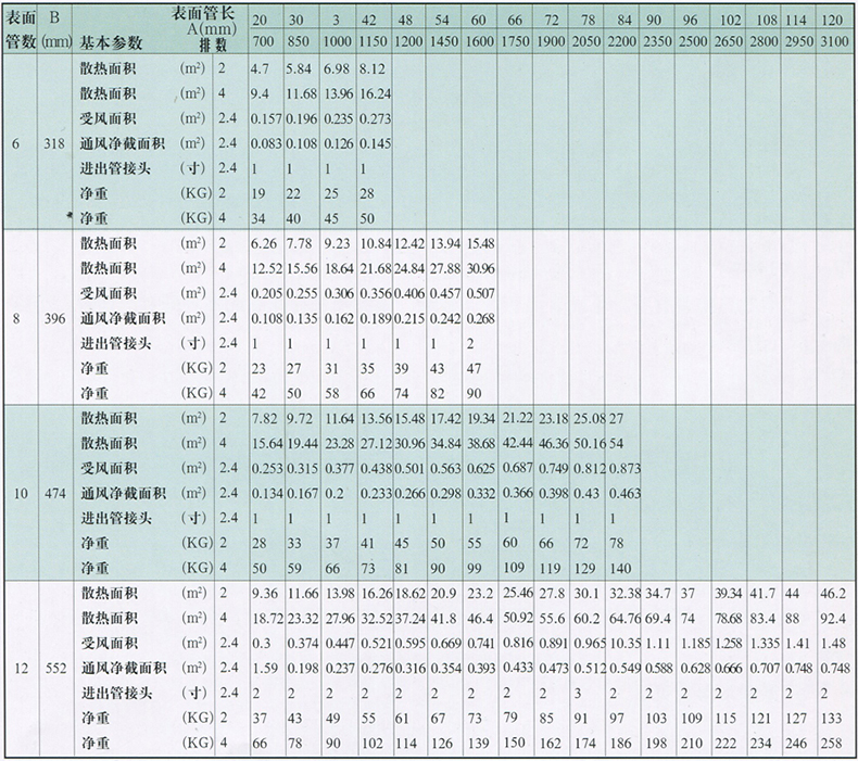 如采用四排,表面管數(shù)為10,管長為42英寸時,則為GL-4-10-42。